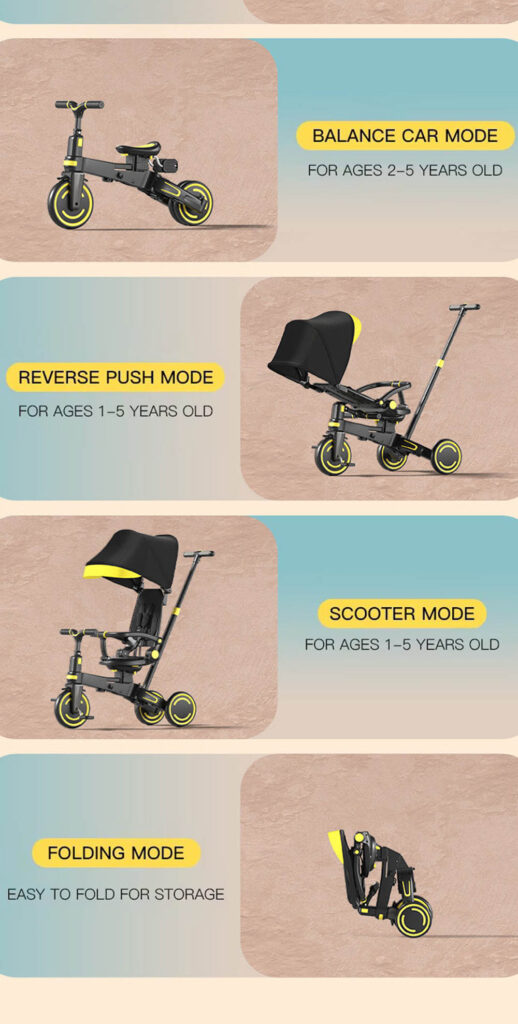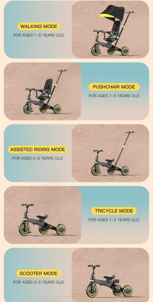 9 different riding modes (tricycle, balance bike, push trike, and more)